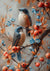Dette maleri forestiller to fugle med blå hoveder, orange bryster og blå og orange vinger, der sidder på en trægren prydet med blå blomster og orange bær. Baggrunden er neutral med en blød, sløret effekt.