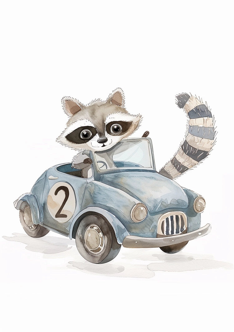 Dette maleri forestiller en vaskebjørn, der kører en lille, blå veteranbil med nummer 2 på døren. Vaskebjørnen sidder på førersædet med ansigtet vendt fremad, og dens buskede hale stikker ud af bilen.