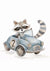 Maleri af en vaskebjørn i blåt med en vintagebil