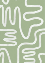 Et abstrakt maleri med hvide, snoede linjer arrangeret i loopende, labyrintlignende mønstre på en blød grøn baggrund.