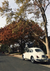 Dette maleri viser en hvid bille parkeret under et stort træ med efterårsfarvede blade på en forstadsgade med synlige huse i baggrunden under en overskyet himmel.