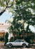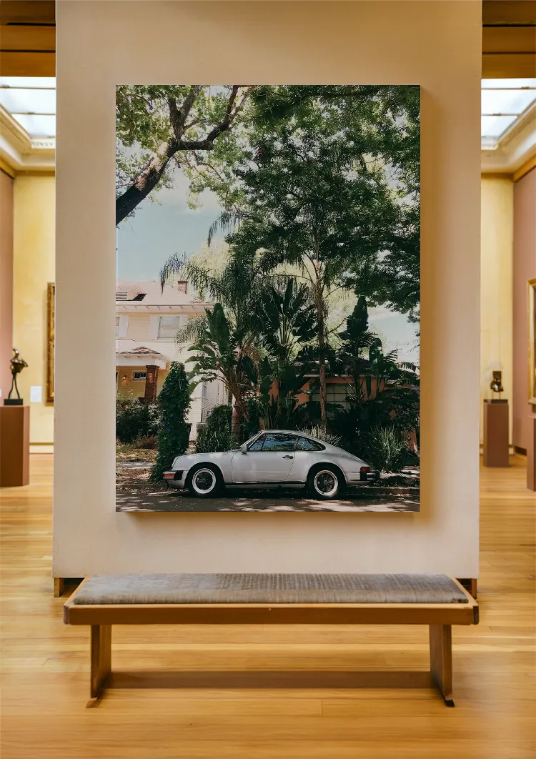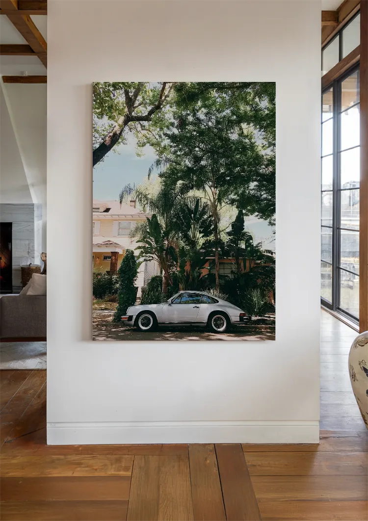 Dette maleri forestiller en klassisk sølvfarvet Porsche 911 parkeret i skyggen af frodige grønne træer foran et toetagers hus med en solrig, klar himmel over sig.