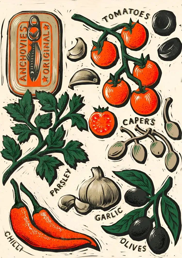 Dette maleri forestiller en kunstnerisk illustration af ingredienser, herunder en dåse ansjoser, tomater, rød chili, hvidløgsfed og sorte oliven, alt arrangeret i en dekorativ stil.