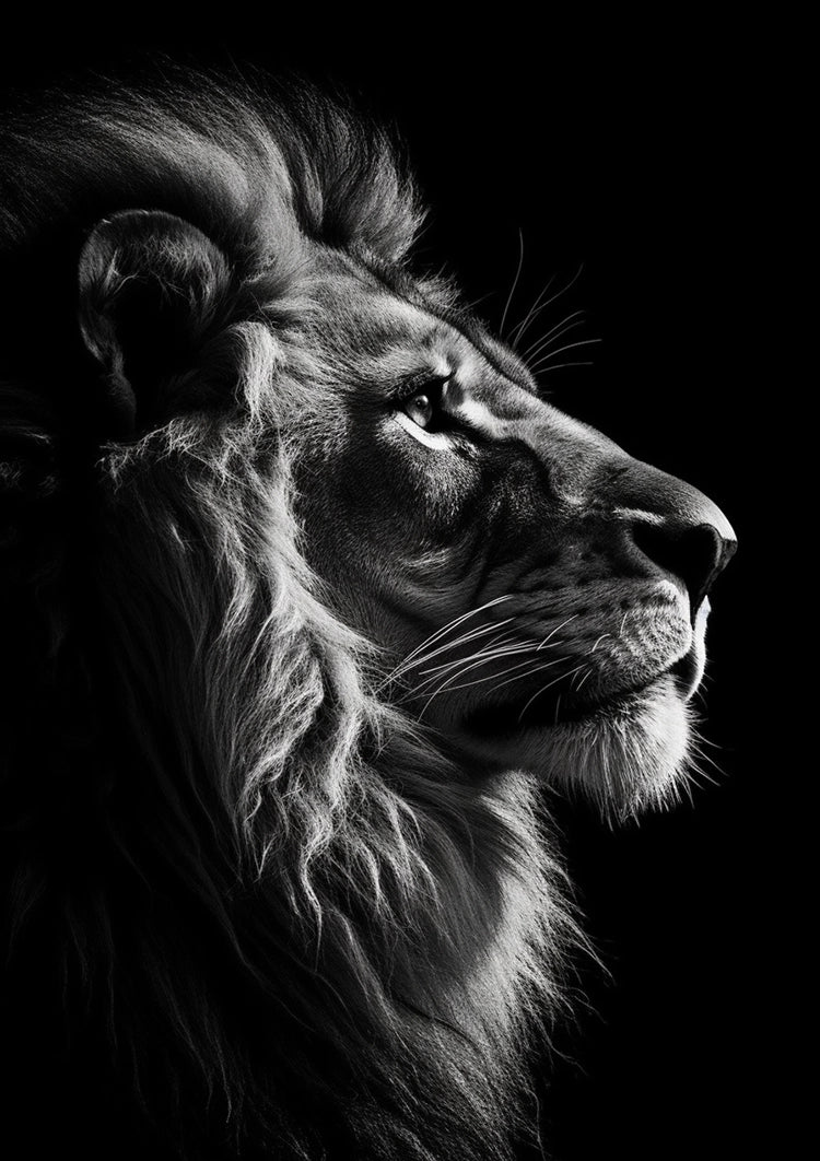 Dette maleri forestiller et sort-hvidt profilportræt af en løve med manke, der kigger til siden. Billedet fremhæver løvens detaljerede ansigtstræk og manke mod en mørk baggrund.