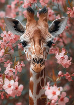 Op dit schilderij pronkt een giraffe te midden van roze kersenbloesems, terwijl hij recht in de camera kijkt. Zijn lange nek en gevlekte vacht vormen een opvallend contrast met de delicate bloemblaadjes en groene bladeren.