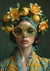 Dit schilderij toont een mooie dame met een hoofddeksel versierd met gele bloemen en citroenen, en een groen getinte bril in antieke stijl. Ze is gekleed in geel-groene outfit met kanten details en staat tegen een donkergroene achtergrond.