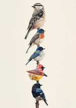 Op dit schilderij zie je zes verschillende vogels zitten op een tak tegen een effen witte achtergrond. Elke vogel heeft een uniek en kleurrijk verenkleed, variërend van aardetinten tot levendige rode, blauwe en gele tinten.