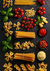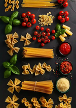 Dit schilderij toont een verscheidenheid aan ongekookte pasta, vergezeld van kerstomaatjes, basilicumblaadjes, pastasaus en geraspte kaas op een donkere ondergrond.
