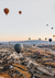 Een schilderij met een prachtig uitzicht op luchtballonnen op verschillende hoogtes.