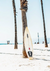 Een schilderij op een wit strand met een surfbord tegen een palmboom.