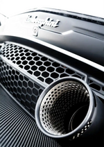 Dit schilderij toont een close-up van de uitlaatpijp van een Lamborghini Huracan Evo, waarbij de texturen van de metalen uitlaatpijp worden benadrukt, met het logo "Lamborghini" zichtbaar.