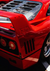 Close-up van de achterkant van een Ferrari F40, waarbij het strakke ontwerp met zichtbare merkinitialen en meerdere ventilatieopeningen wordt getoond.