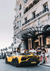Een gele Lamborghini Aventador SVJ staat geparkeerd voor een sierlijk hotel en trekt de aandacht van een menigte mensen die hem bewonderen en foto's maken. De scène speelt zich af in een bruisend stedelijk gebied.