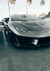 Een matzwarte Lamborghini Evo sportwagen geparkeerd op straat, met palmbomen op de achtergrond onder een heldere hemel.