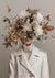 Dit schilderij toont het gezicht van een persoon in een crèmekleurige jas en coltrui, gedeeltelijk verborgen door een groot bloemstuk met bloemen en bladeren in wit, beige en bruin tegen een neutrale achtergrond.