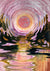 Een abstract landschap met rode zon en reflecties in het water, opgebouwd uit roze en goudtinten.