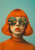 Dit schilderij toont een vrouw met fel oranje haar en lippenstift, gekleed in een kleurrijke outfit, terwijl ze een grote ronde zonnebril draagt die een afbeelding van goudvissen weerspiegelt.