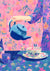 Een speelse explosie van pastelkleuren met een hand die thee schenkt, als een uitnodiging tot rust en gezelligheid.
