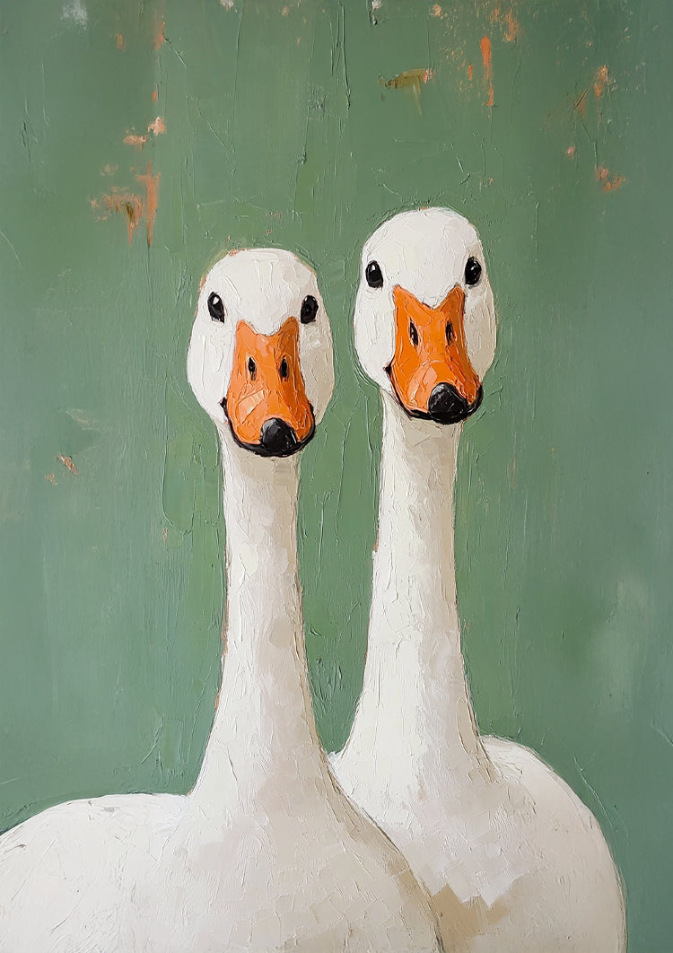 Twee ganzen staren recht naar de kijker, met een groene achtergrond en dikke penseelstreken.