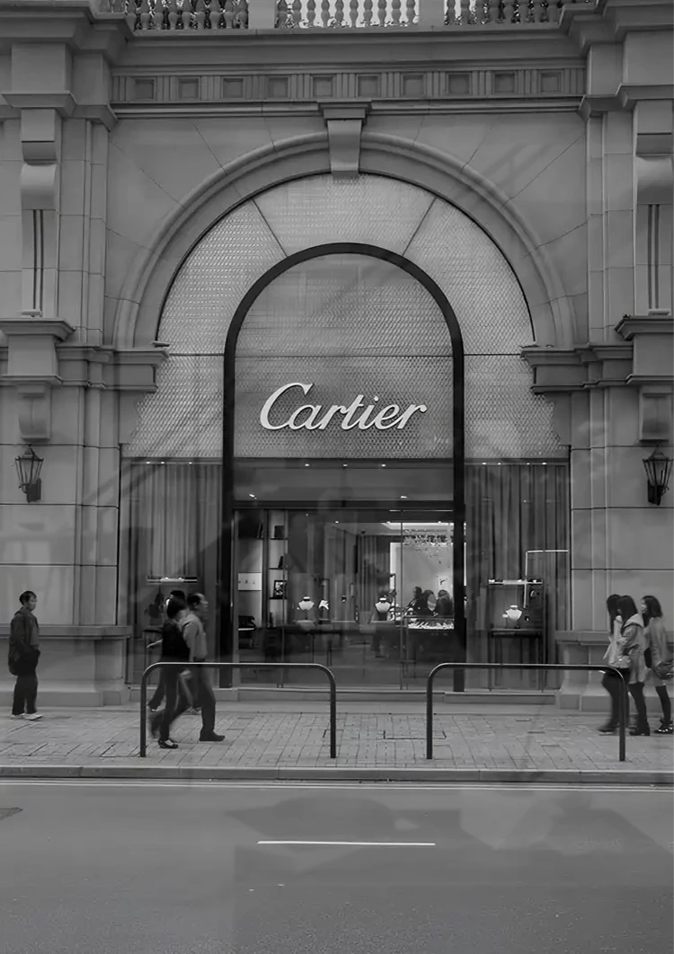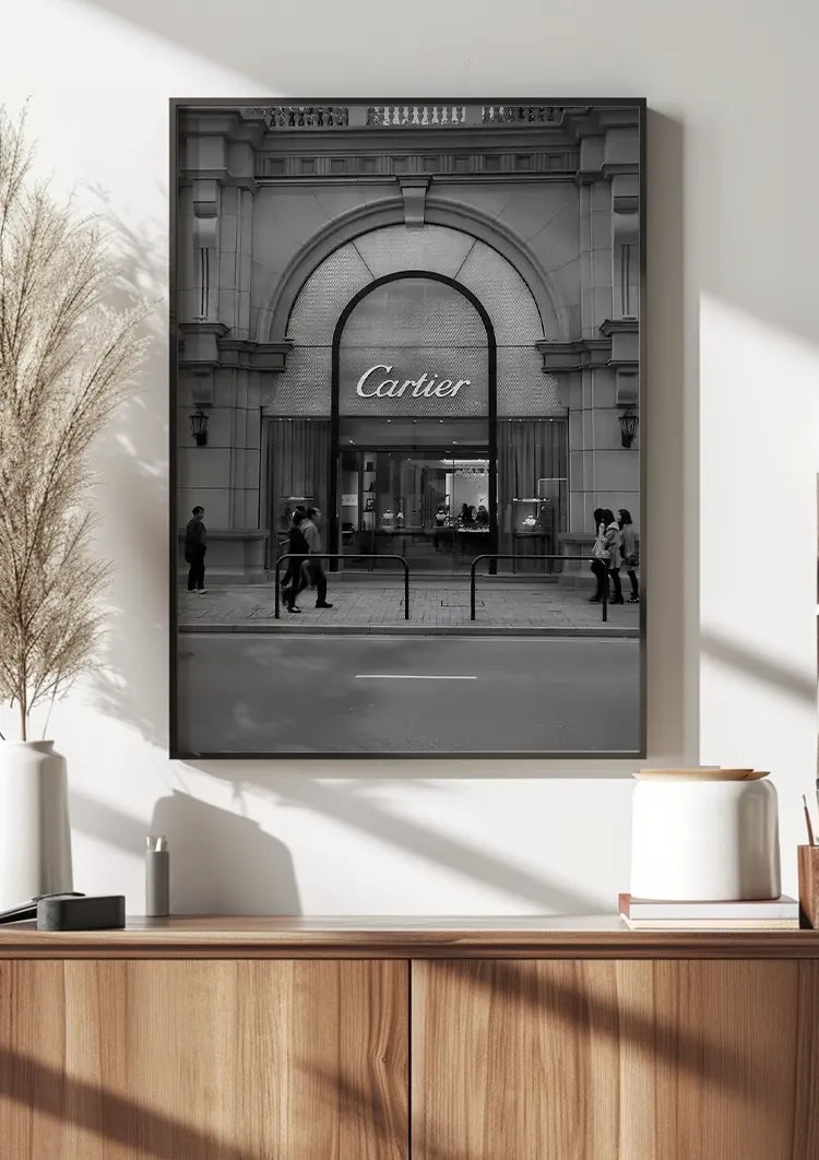 Een zwart-wit schilderij van voetgangers die langs de elegante ingang van de Cartier winkel lopen.