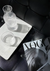 Een stijlvolle zwart-wit schilderij met een glas gevuld met water op een dienblad, naast een vogue tijdschrift.
