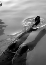 Dit zwart-wit schilderij vangt een zwemmende persoon in beweging, omringd door dansende rimpelingen. Het toont het hoofd en de armen van de zwemmer boven het oppervlak, een krachtige uitdrukking van vrijheid.