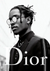 Een zwart-wit schilderij van een man met een bril met daaronder een groot DIOR logo.