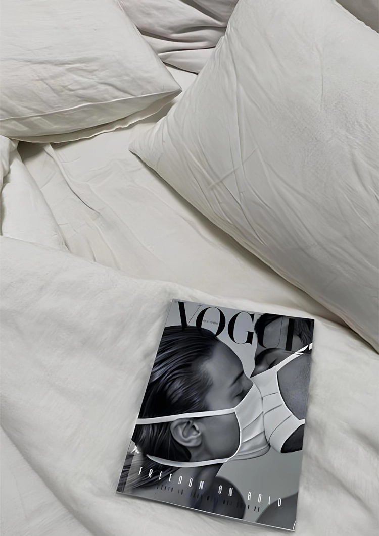 Zwart-wit schilderij van een bed met verkreukelde witte lakens en kussens waarop een tijdschrift van Vogue ligt.