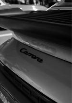 Dit schilderij toont een close-up zwart-witfoto van de achterkant van een Porsche Carrera, met de nadruk op het "Carrera" embleem. De afbeelding benadrukt de strakke lijnen en contouren van het ontwerp van de auto.