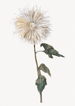 Dit schilderij toont een aquarelillustratie van een enkele bloem met een pluizige, ronde, crèmekleurige bloei. De bloemsteel wordt geflankeerd door twee groene, getande bladeren tegen een egale witte achtergrond.