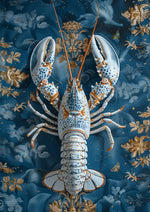 Schilderij van een lichtblauwe kreeft met gouden accenten op een sierlijke achtergrond met blauwe en gouden bloempatronen. De prominente klauwen en opgeheven antennes trekken de aandacht.