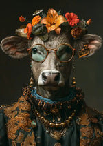 Op dit schilderij zie je een koe met een ronde bril en een bloemenhoofddeksel, versierd met oranje en rode bloemen. Met gelaagde kettingen en een gedetailleerd kledingstuk oogt de koe bijna als een verfijnde antropomorfe creatie.