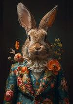 Op dit schilderij zie je een konijn in een portretstijl, gehuld in een charmant pak met bloemenmotieven en een verfijnde kraag met ruches. De achtergrond is donker, met bloemendetails die het ontwerp van het pak versterken, wat een speelse en artistieke toets toevoegt.