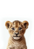 Dit schilderij brengt een levensechte weergave van een schattige leeuwenwelp tegen een heldere, witte achtergrond. Met gespitste oren en ronde, nieuwsgierige ogen straalt het speelsheid en verwondering uit.
