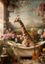 Dit schilderij toont een surrealistisch tafereel van een giraffe in een witte badkuip, omringd door bloemen en planten met pinguïns en kroonluchters in de kamer.