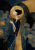Een elegante vrouw gehuld in blauw en goud, met pauwenveren als symbool van trots en mysterie.