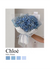 Een schilderij met een arm van een persoon met groot boeket lichtblauwe bloemen, verpakt in blauw en wit papier. Met daaronder de tekst Chloé, Parijs, Frankrijk.