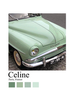 Een schilderij van een vintage mintgroene oldtimer geparkeerd op straat. Daaronder de naam "Celine" en de locatie Parijs, Frankrijk.