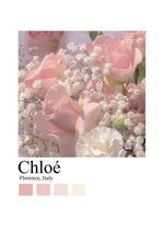 Een schilderij met sereen bloemenarrangement met delicate roze rozen en witte bloemen. Met de tekst "Cloé, Florence, Italië".