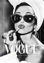 Een zwart-wit schilderij van een stijlvolle vrouw, gekleed met een grote zonnebril en een handdoek op haar hoofd, terwijl ze lippenstift aanbrengt. Daarbij is het logo van VOGUE te lezen.
