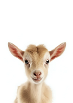 Dit schilderij toont een close-upbeeld van een geinig geitje die naar voren kijkt. Het geitje heeft grote oren, een lichtbruine vacht en een nieuwsgierige uitdrukking.
