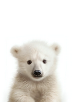 Dit schilderij brengt een intieme close-up van een schattige ijsbeerwelp met een witte, pluizige vacht die direct in de camera kijkt. De eenvoudige witte achtergrond laat het focuspunt op de welp rusten.