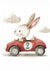 Dit schilderij toont een lief konijntje dat een kleine rode raceauto bestuurt met het nummer 2 erop. Het konijn rijdt tevreden rond.