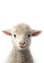 Dit schilderij toont een close-up van een jong lammetje met gekrulde witte wol en roze oren, rechtstreeks naar de camera starend. De achtergrond is zuiver wit, waardoor het lammetje het middelpunt van het beeld is.