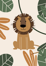 Dit schilderij toont een illustratie van een schattige leeuw met bruine manen, rustig zittend op een lichte achtergrond. De afbeelding heeft grote groene en oranje tropische bladeren in de hoeken, waardoor een kader met een natuurthema rond de leeuw wordt toegevoegd.