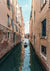 Dit schilderij heeft een smal kanaal in Venetië, geflankeerd door hoge, verouderde gebouwen met luiken voor de ramen.