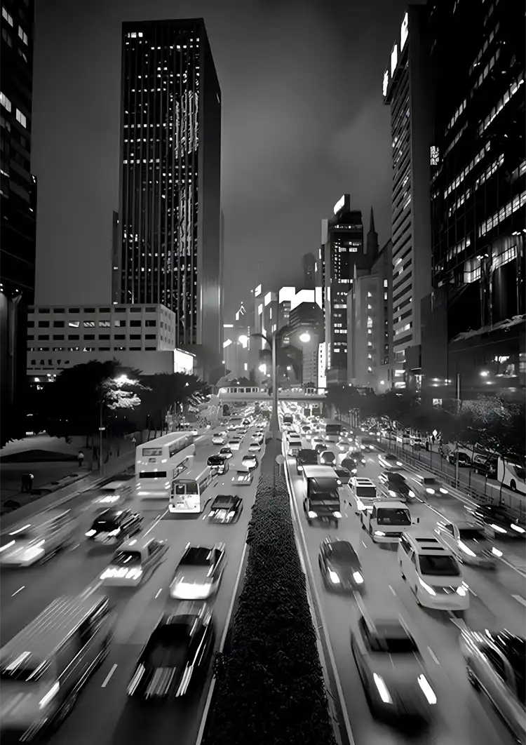 Zwart-wit schilderij van een uitzicht op een drukke weg met hoge gebouwen.
