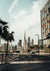 Dit schilderij toont een uitzicht vanuit een weg met hoge gebouwen in de verte.