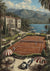 Een nostalgische scène van een luxe villa, tennisbaan en idyllisch meer, badend in zonlicht.