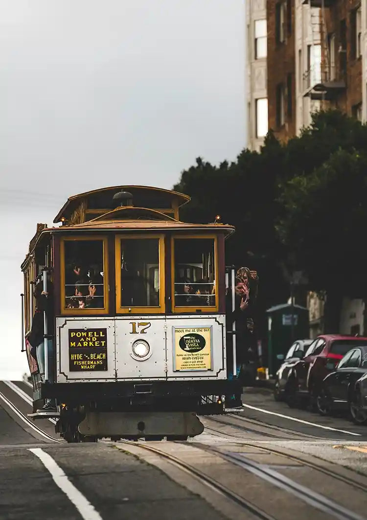 Een schilderij met een traditionele tram vol passagiers die door een straat geparkeerde auto's en gebouwen rijdt.